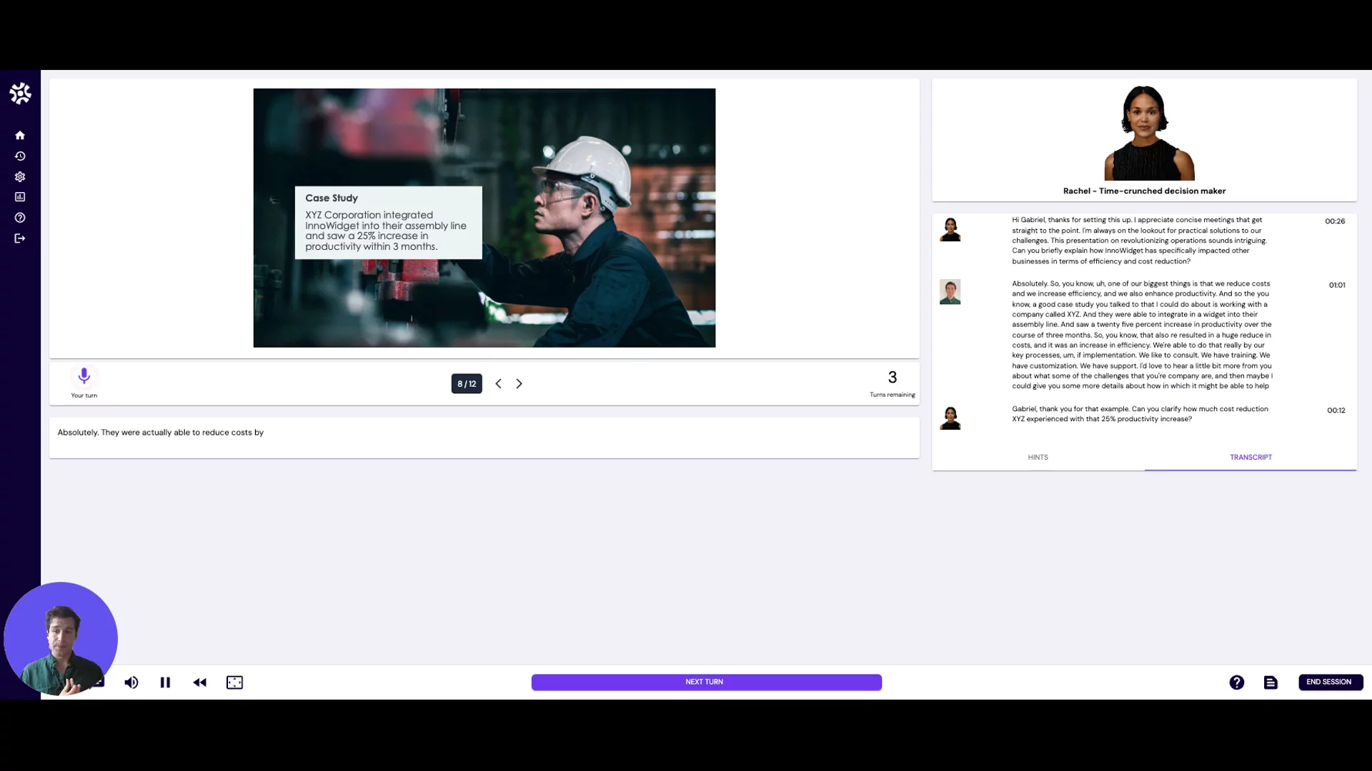 - Sales Training: Helping sales teams practice and refine their pitches to close more deals.