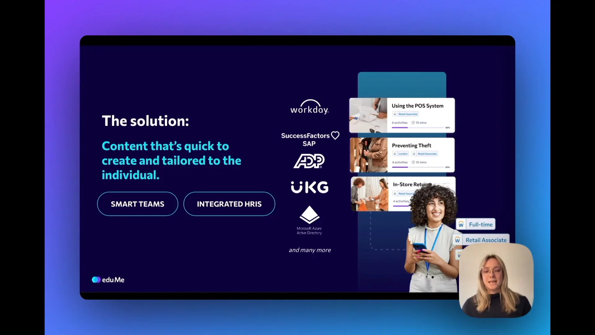 eduMe integrates into the tools your frontline already uses day-to-day - including Workday, Microsoft Teams, Beekeeper and more - increasing engagement and maximising the impact of your training investment.