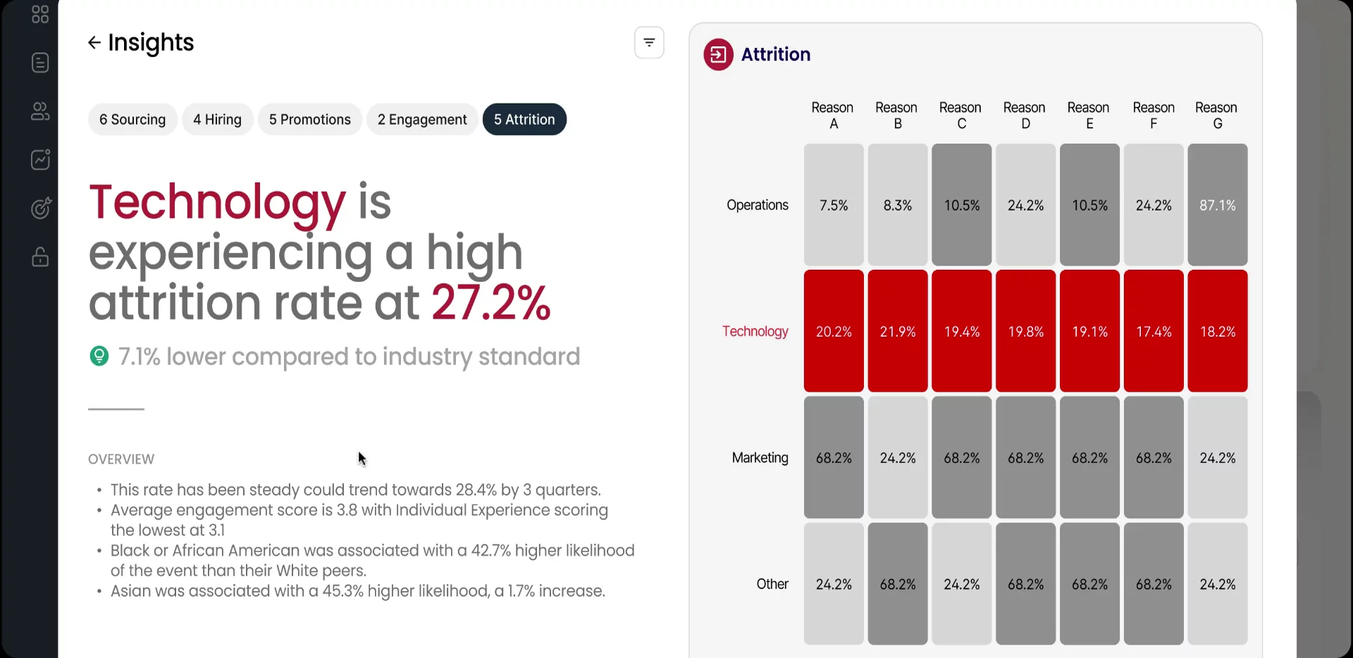 Our turnkey, customizable data visualizations and tailored recommendations empower you to drill down into every step of the employee journey to identify root causes and invest strategically across sourcing, hiring, engagement, promotions, and retention.
