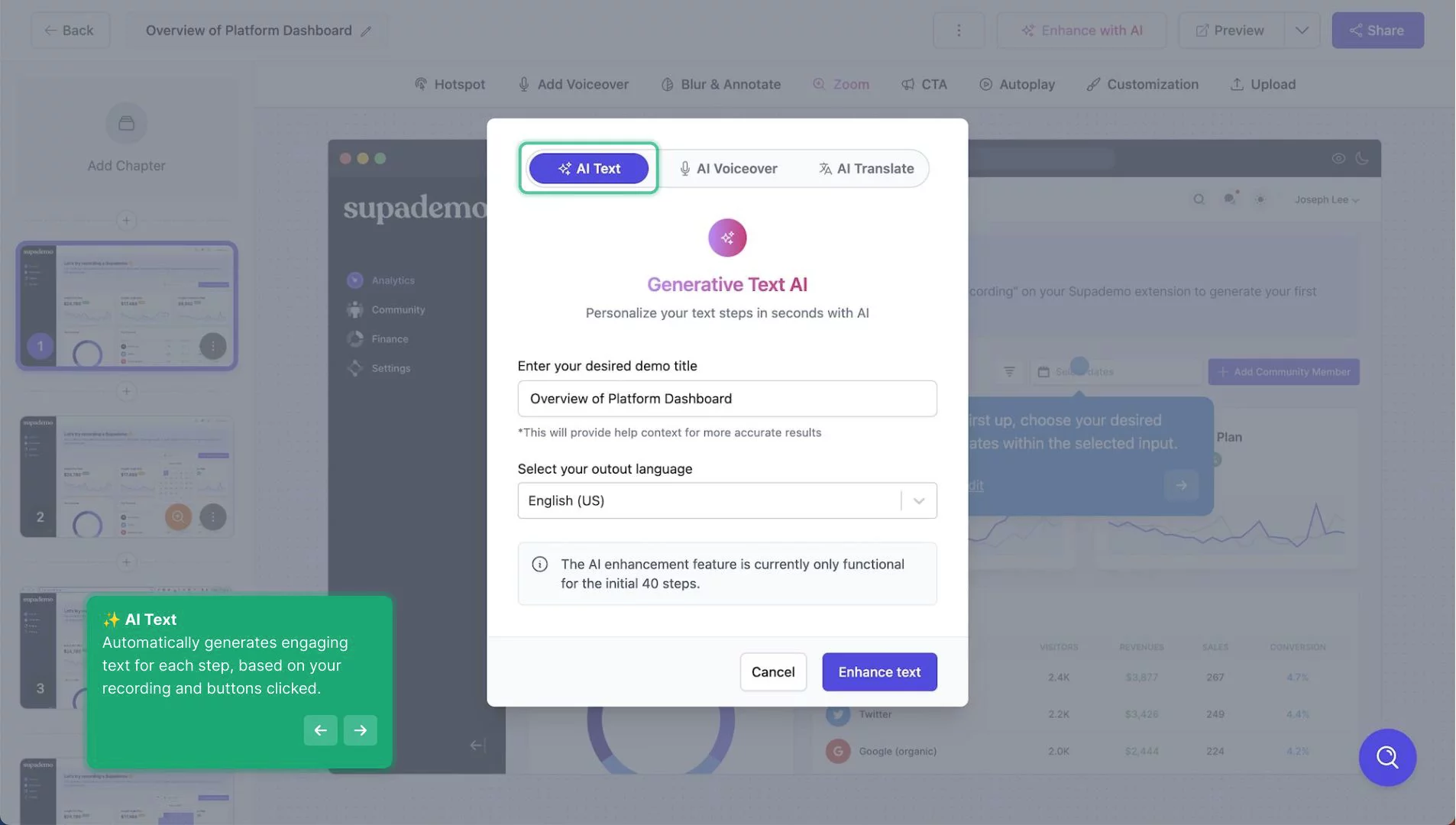 - AI Voiceover and Text: Overlay synthetic, AI-powered voices to any Supademo. Bulk rewrite text hotspots based on your prompt and context.