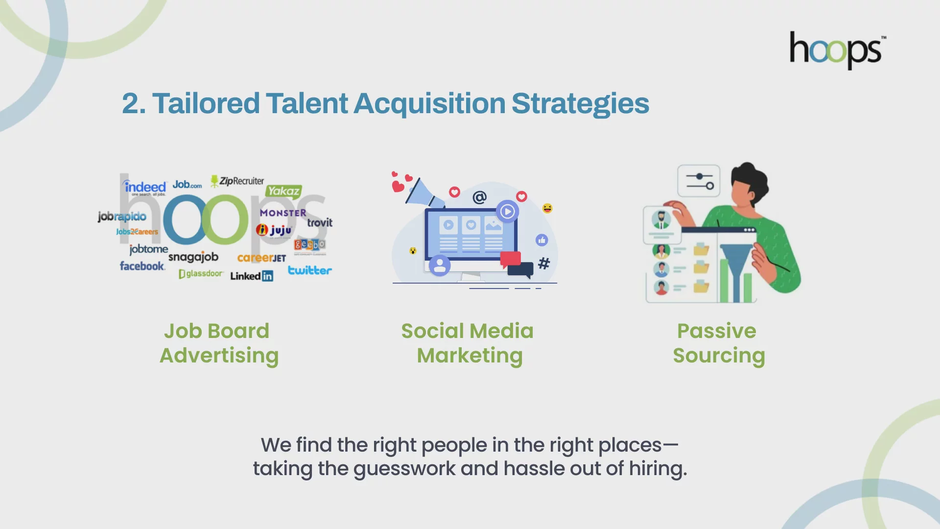 Comprehensive Recruiting ServicesHow Hoops’ recruiting team can manage the full hiring process or step in where needed, with tailored strategies.