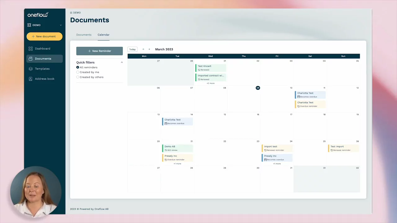 Video shows a quick look at OneFlow, a tool that makes contract work easy and fast. You see the Dashboard where you track documents, deal status, and get live reports. You learn how to search, tag, and sort files, set reminders on a calendar, and use ready-made templates for NDAs, job contracts, or proposals. The Address Book and links to apps like Salesforce and HubSpot keep all your contacts and tools in one place. You also see how to send safe e-signatures from any device. OneFlow fixes slow, messy contract steps by handling everything from creation to archiving.