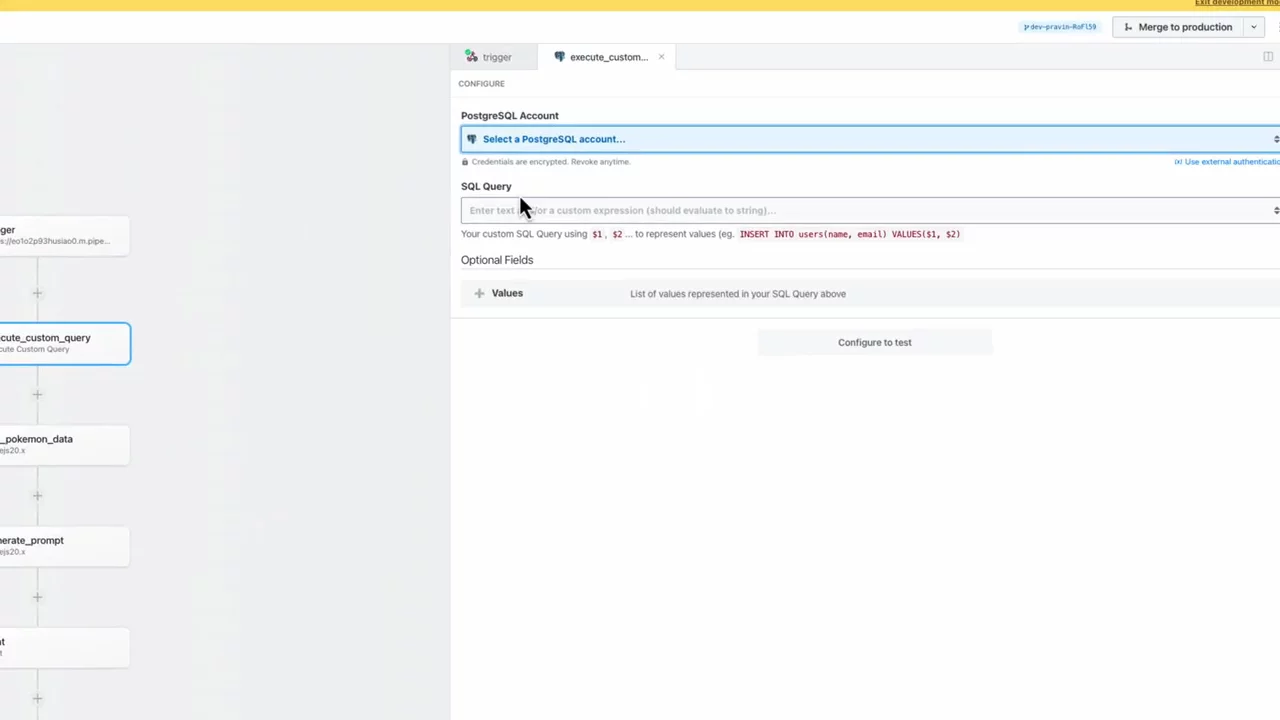 Merging to Production & End-to-End TestingMerge changes from the development branch into production via GitHub sync, review a diff of all updates, run an end-to-end test with a new Pokémon, inspect execution, and validate the Slack message.